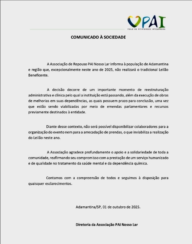 📢 Comunicado Importante A Associação PAI Nosso Lar informa que, excepcionalmente em 2025, não será realizado o tradicional Leilão Beneficente, devido a reformas e reestruturações internas em andamento.